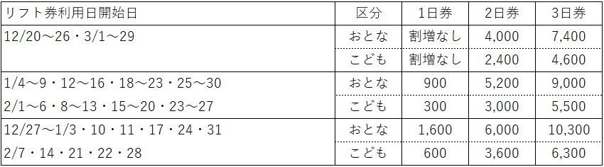 - ・日程によりリフト券利用日割増が必要です(下記、割増表をご確認ください)