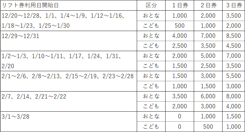 ※リフト券は利用開始日を選択できますが、連続利用日のリフト券となります