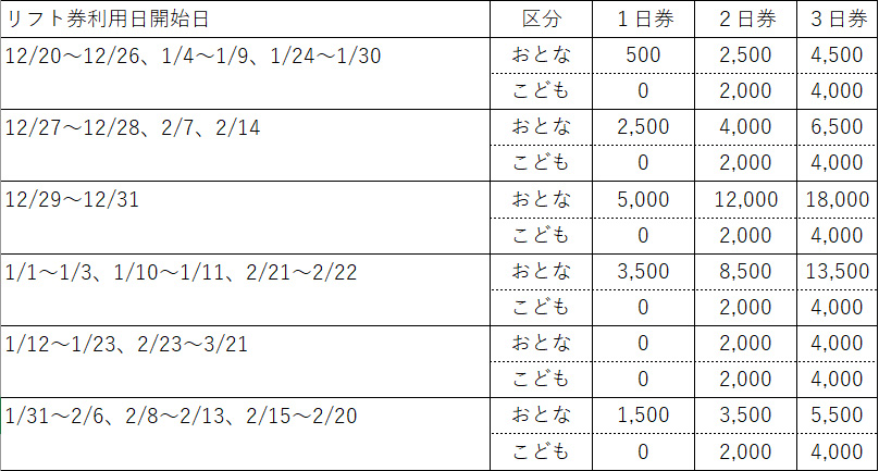 ※リフト券は利用開始日を選択できますが、連続利用日のリフト券となります