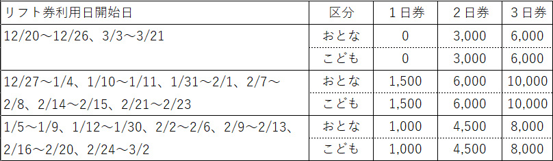 ※リフト券は利用開始日を選択できますが、連続利用日のリフト券となります
