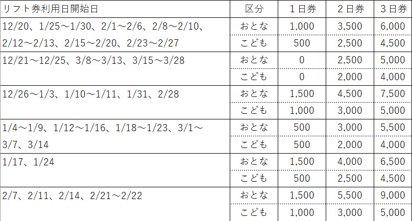 リフト券利用日割増料金表