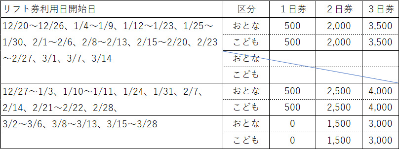 ※リフト券は利用開始日を選択できますが、連続利用日のリフト券となります